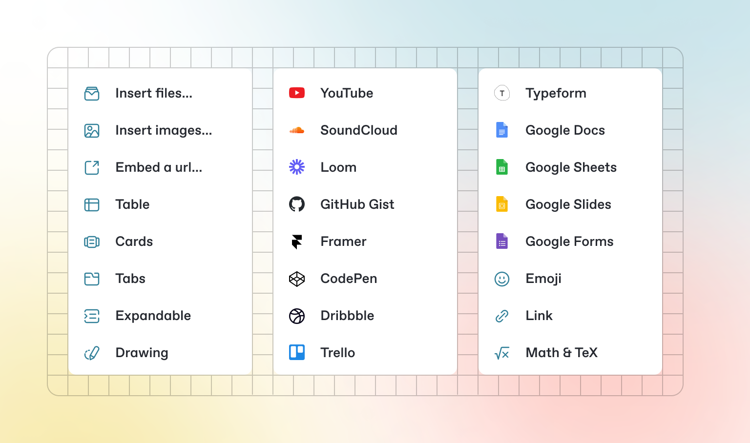 GitBook supports thousands of embedded websites out-of-the-box, simply by pasting their links. Feel free to check out which ones are supported nativelyarrow-up-right.